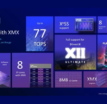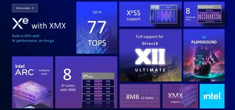 Un solution graphique de dernière génération est en outre intégré à la puce d’Intel ; baptisée Arc 140T, elle se compose de 8 cœurs Xe fonctionnant à une fréquence maximale de 2,35 GHz. Ce moteur graphique supporte les instructions XMX (Xe Matrix Extensions) permettant d’accélérer les tâches d’intelligence artificielle et pouvant également se montrer utiles avec certaines techniques de rendu ou de mise à l’échelle des images comme le XeSS 2, si elles sont utilisées par les développeurs.